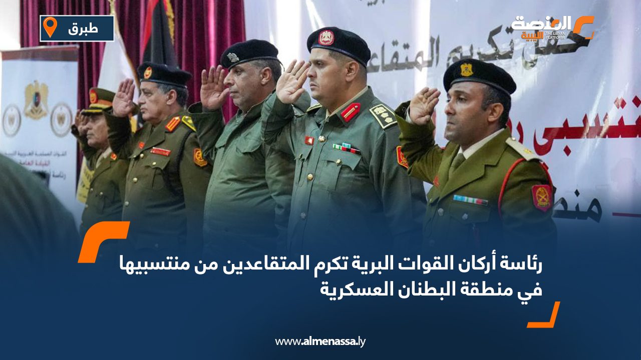 قامت شعبة التوجيه المعنوي برئاسة أركان القوات البرية، اليوم، بتكريم عدد من المتقاعدين من منتسبي القوات المسلحة في منطقة البطنان العسكرية، تنفيذًا لتعليمات القائد العام للقوات المسلحة المشير خليفة حفتر، وتحت إشراف رئيس أركان القوات البرية.