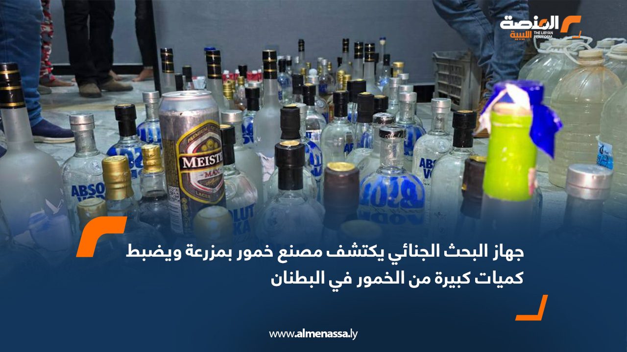 تمكن جهاز البحث الجنائي فرع البطنان ، ضبط 124 زجاجة من الخمور المستوردة، و62 قنينة بحجم 6 لترات، تحتوي على خمور محلية الصنع، بالإضافة إلى مصنع متكامل؛ لتصنيع الخمور في احدى المزارع.