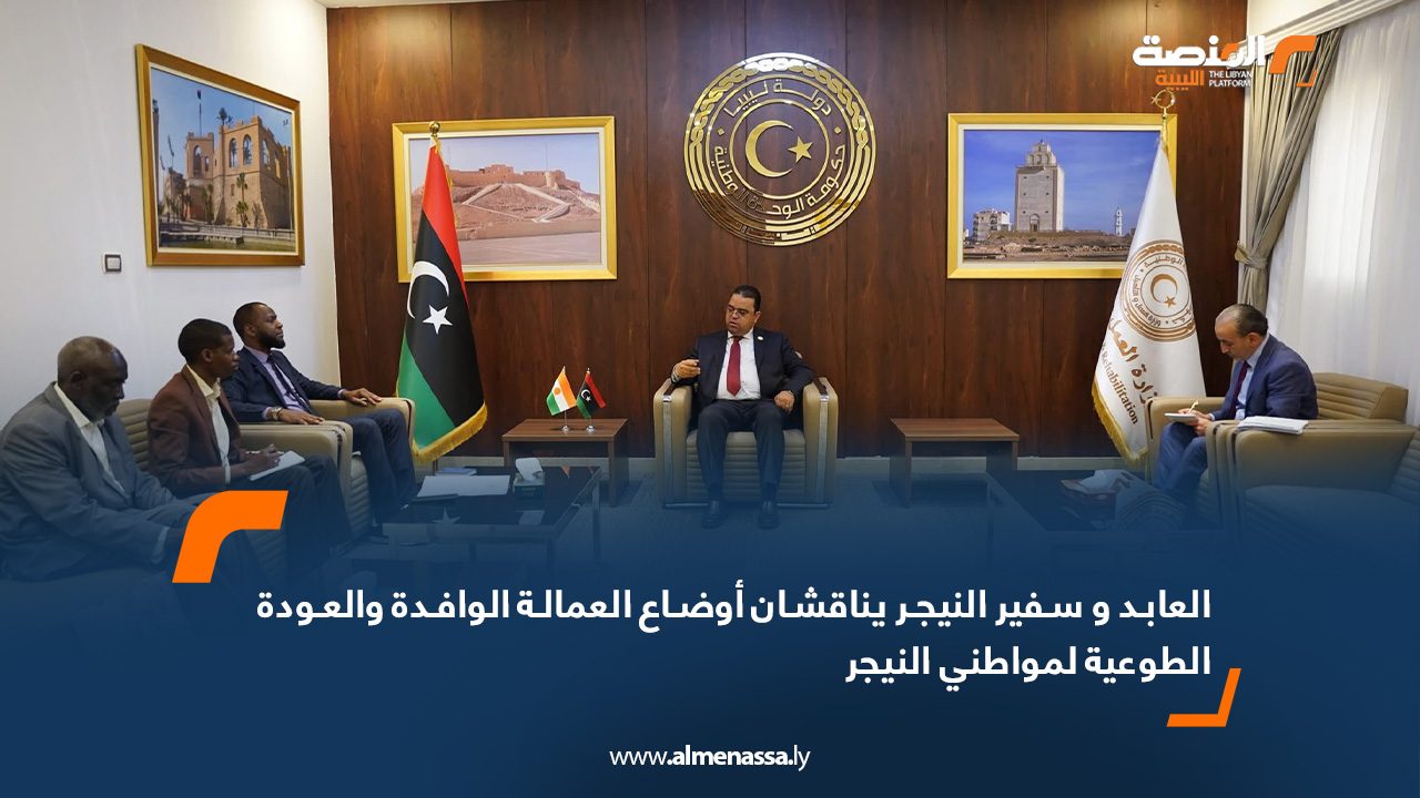 ناقش وزير العمل والتأهيل في حكومة الوحدة الوطنية علي العابد رفقة سفير النيجر لدى ليبيا عبدالعزيز لولي ، إمكانية تنظيم العمالة الوافدة وفقاً لقوانين العمل في ليبيا والحد من دخول العمالة بطرق غير شرعية.