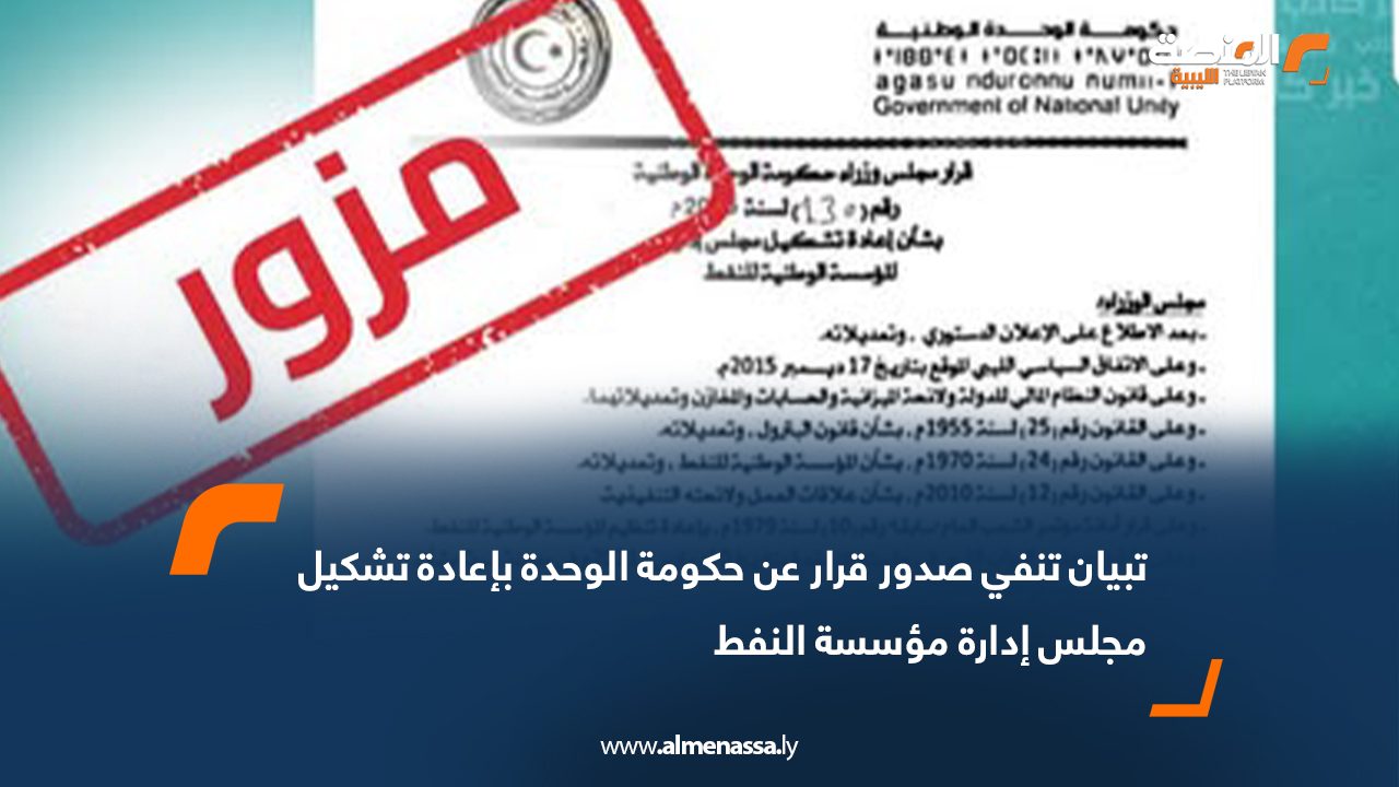 نفت منصة تبيان ما تم تداوله عبر بعض وسائل التواصل الاجتماعي حول صدور قرار عن حكومة الوحدة الوطنية يقضي بإعادة تشكيل مجلس إدارة المؤسسة الوطنية للنفط.