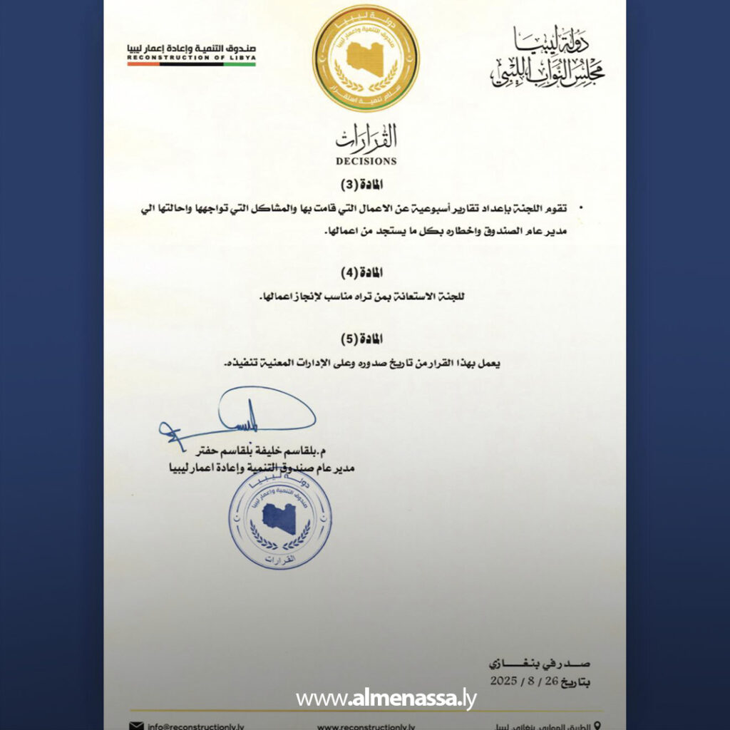 أصدر مدير عام صندوق التنمية وإعادة إعمار ليبيا، المهندس بالقاسم حفتر، قرارًا يقضي بتشكيل لجنة خاصة لمعالجة أزمة الكهرباء في البلاد.