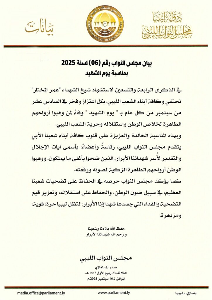 أصدر مجلس النواب بيانًا في الذكرى الرابعة والتسعين لاستشهاد شيخ الشهداء عمر المختار، مؤكدًا أن السادس عشر من سبتمبر سيبقى يومًا خالدًا يخلد تضحيات الليبيين من أجل الحرية والاستقلال.