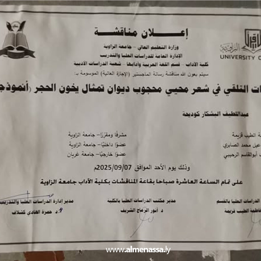 ففي هذا الشهر سبتمبر من العام الجاري 2025 م في جامعة الزاوية بكلية الآداب قسم اللعة العربية وآدابها وتحت عنوان (( جماليات التلقي في شعر محي الدين محجوب _ ديوان تمثال يخون الحجر أنموذجا )) قدمت للمناقشة رسالة ماجستير للأديب الكبير وطالب الماجستير الأكاديمي الأستاذ عبد اللطيف البشكار .. وكانت الدراسة أنموذجا في النقد الأدبي ما بعد الحداثي حيث تشكلت اللجنة من الدكتورة فاطمة الطيب قزيمة عضواً مشرفاً ومقرراً جامعة الزاوية والدكتور إسماعيل محمد الصابري عضوا داخليا جامعة الزاوية والدكتور سوف أبو القاسم الرحيبي عضواً خارجياً جامعة غريان .