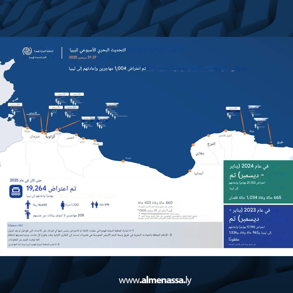 أعلنت المنظمة الدولية للهجرة أن خفر السواحل والجهات المعنية في ليبيا اعترضت وأعادت 1,004 مهاجرين غير نظاميين إلى الموانئ الليبية، وذلك خلال الفترة ما بين 21 و27 سبتمبر 2025.